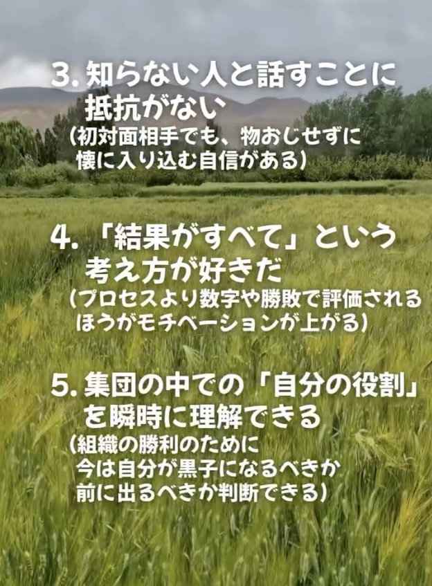 自己分析/適性診断チャート 6.体力とタフさには絶対の自信がある 7.稼ぎたい・モテたい・成功したいという欲望が強い 8.トラブルが起きるとむしろワクワクする