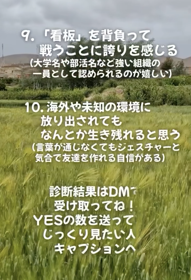 自己分析/適性診断チャート 9.「看板」を背負って戦うことに誇りを感じる 10.海外や未知の環境に放り出されてもなんとか生き残れると思う