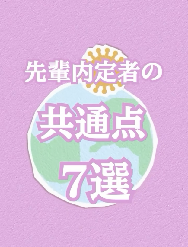 先輩内定者の共通点7選 ①自己分析を”言語化”する ②志望理由「自分の経験x企業」 ③面接は数をこなす ④業界研究は徹底的に ⑤苦手なことは練習で潰す ⑥ESは”自分の言葉”にこだわる ⑦1人で抱え込まない