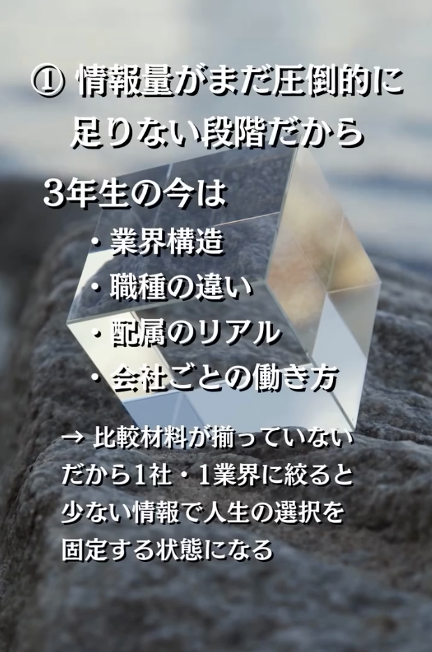 早期選考の落とし穴 業界を決めすぎる ①情報量がまだ圧倒的に足りない段階だから 3年生の今は・・・