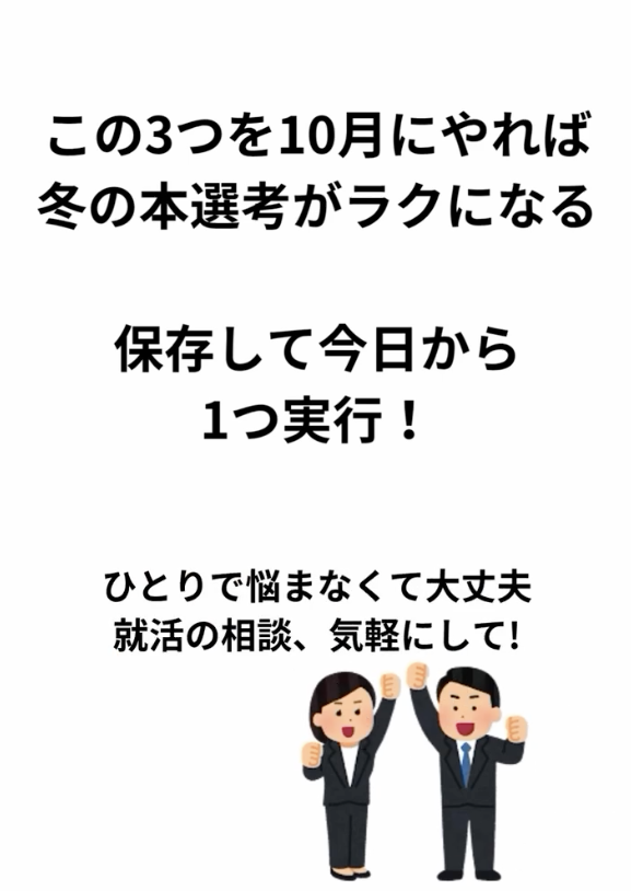 ・自己分析の再チェック ・業界分析をアップデート ・アウトプット練習 この3つを10月にやれば冬の本選考がラクになる