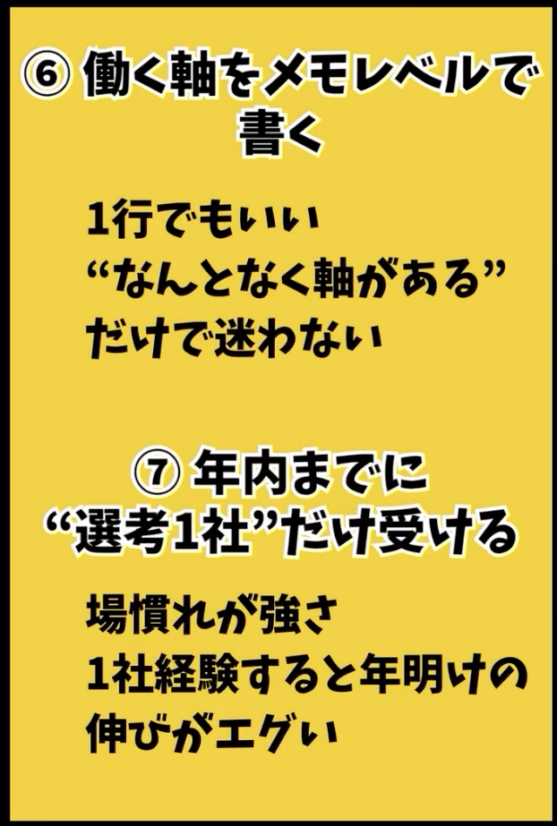 今やる人だけ”年明けに強くなる” ⑥働く軸をメモレベルで書く ⑦年内までに”選考1社”だけ受ける